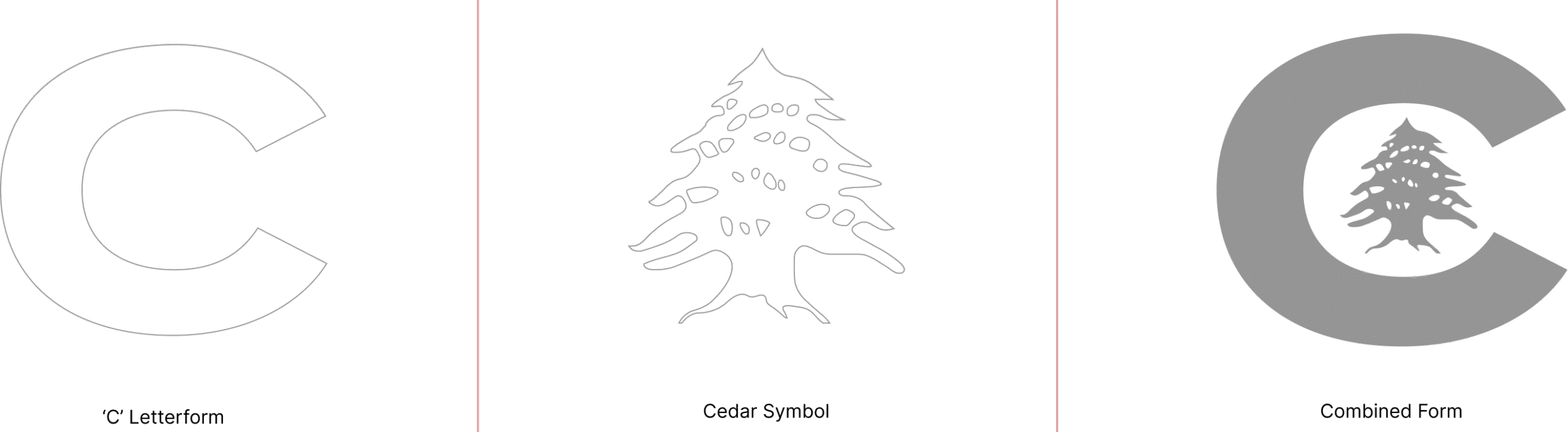 Building on those ideas, the cedar was reinterpreted as a simplified geometric form—colored in deep blue to represent stability and subtly nod to the client’s American roots. Framed within a bold red “C” for Charbel, the mark feels strong and balanced while maintaining a refined minimalism. The open letterform breaks at the top and bottom, creating three distinct pillars that represent resilience, reliability, and connection—values that define both the client and his approach to real estate.